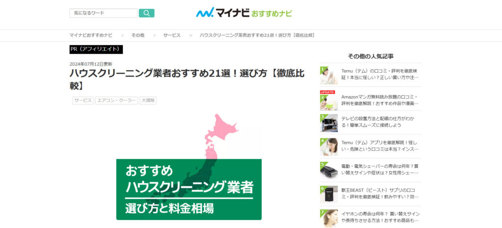 さまざまなハウスクリーニング業者様の強みや料金をわかりやすくまとめた記事になっています。